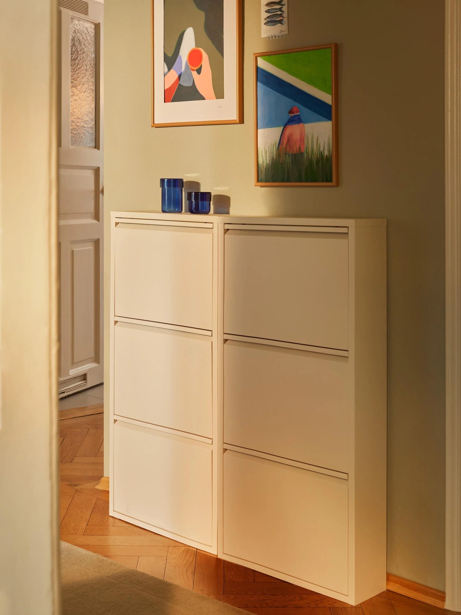 For a cohesive look in a long hallway, line up multiple shoe cabinets in a row to create a seamless and stylish storage solution.
