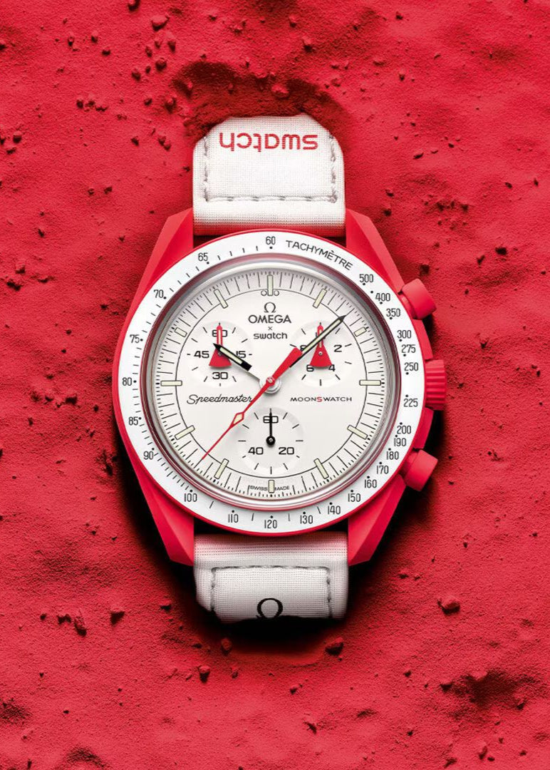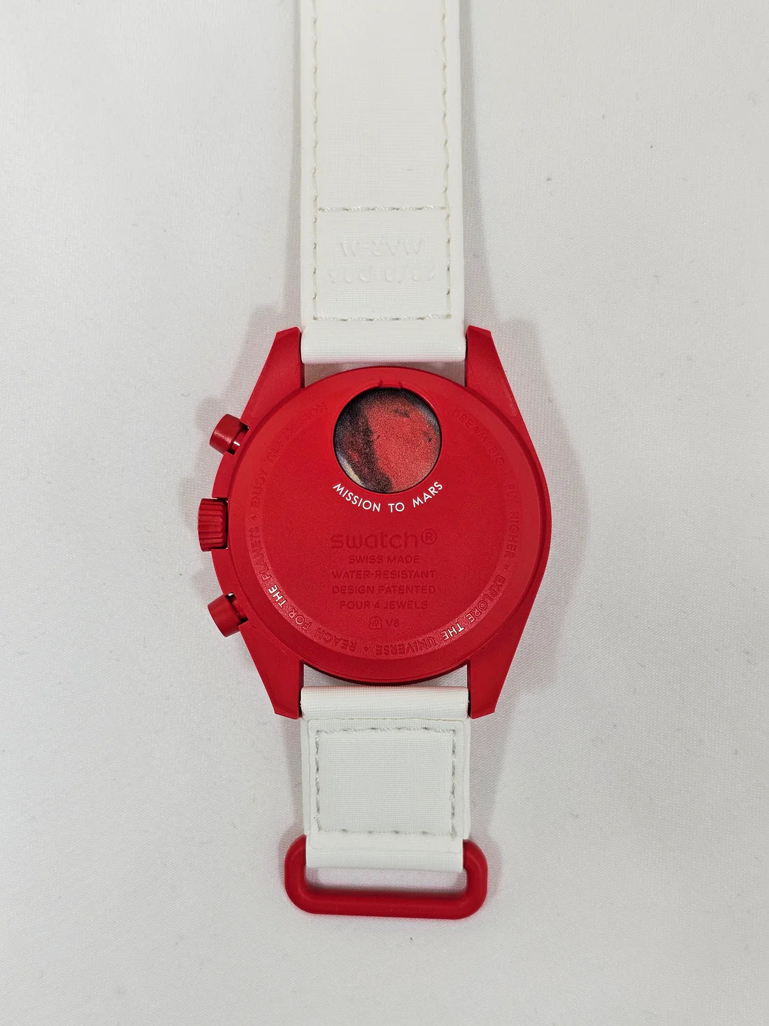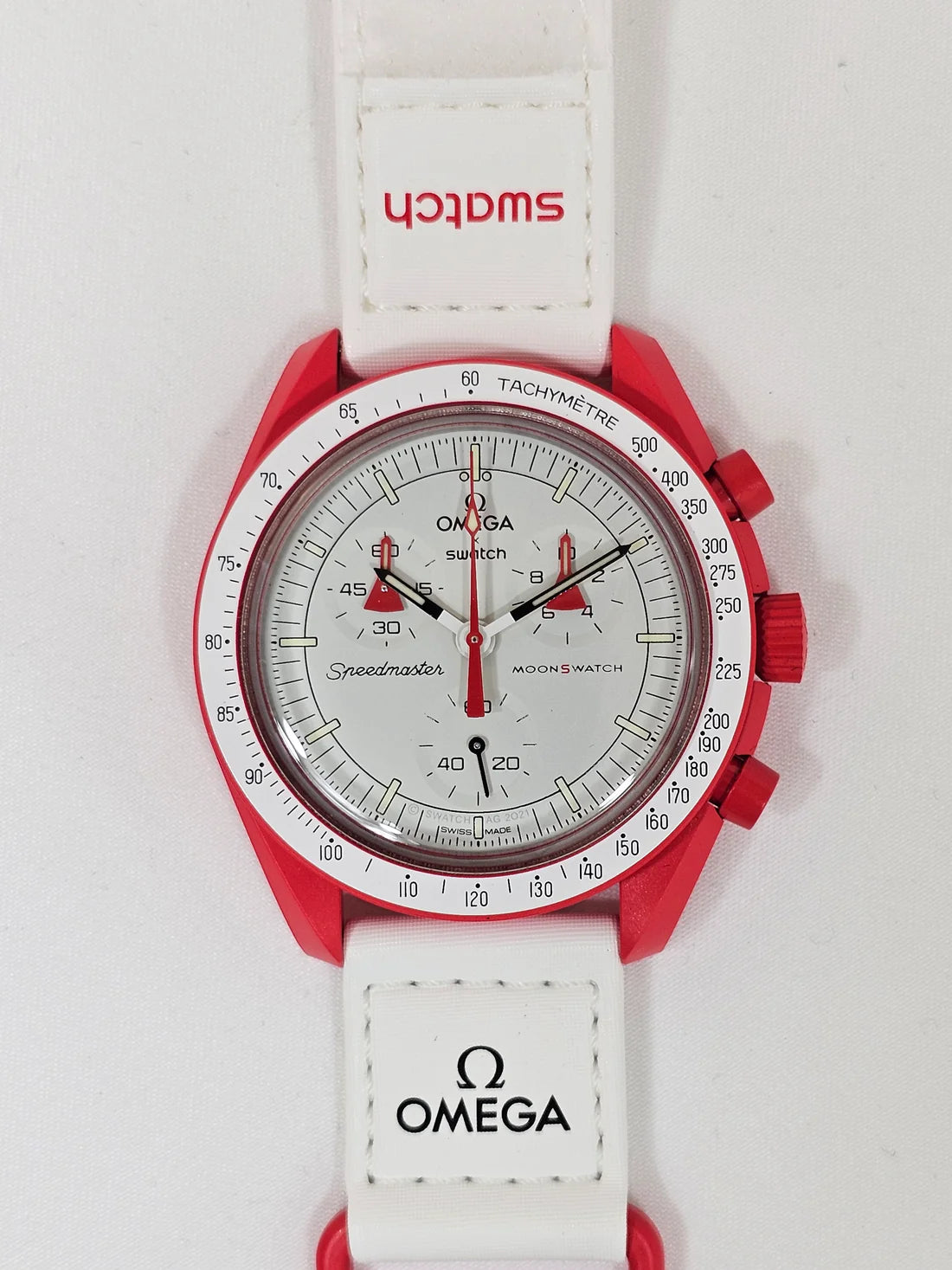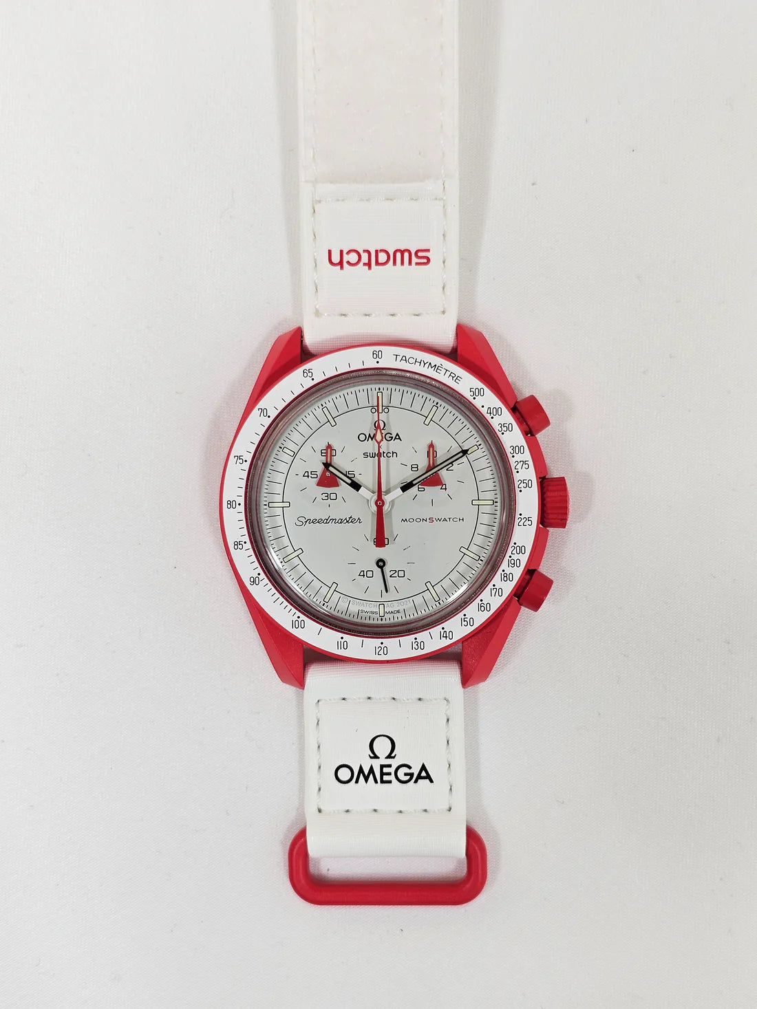 Pay homage to Mars with this vibrant tribute, where fiery red hues beautifully contrast against a bright white dial and VELCRO© strap. The chronograph seconds hand, in a striking red, complements playful spacecraft-shaped hands on the hours and minutes subdials. Each dial proudly showcases OMEGA X SWATCH branding, the iconic Speedmaster logo, and the new MoonSwatch emblem.